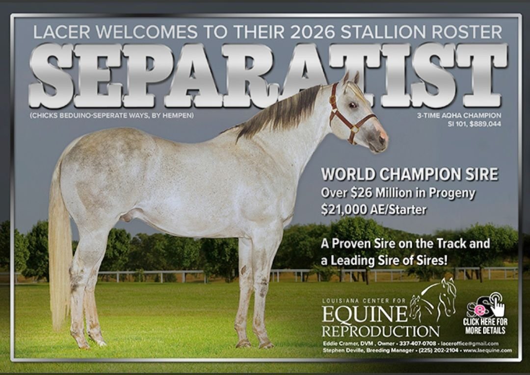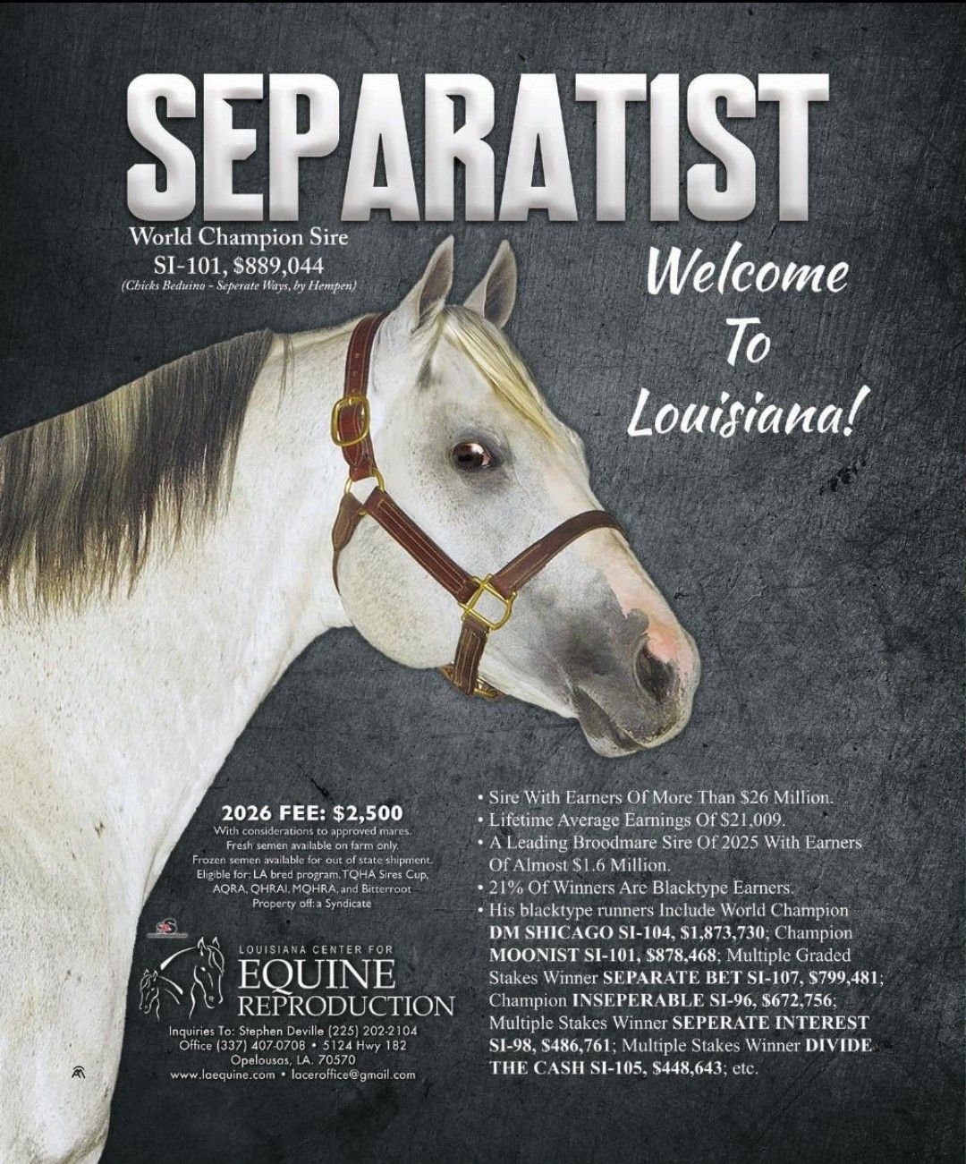 - SEPARATIST FIRSTDOWN SI 109, h. Shesa Firstdown Jess by First Down Dash (11 wins to 3, $436,117 1st-Harrah’s Entertainment Futurity S.-G3, 1st-Gillespie County Fair Futurity-G3, 1st-Evangeline Downs Futurity, 1st-Firecracker Derby, etc.)
